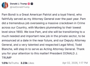 President Trump announced Pam Bondi’s departure from her role as U.S. Attorney General on Truth Social on April 2. (Image: Donald Trump / Truth Social)
