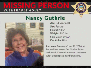 Nancy Guthrie was last seen in the Catalina Foothills area on Saturday night, according to the Pima County Sheriff’s Department. Her family reported her missing on Sunday around noon local time, authorities said.