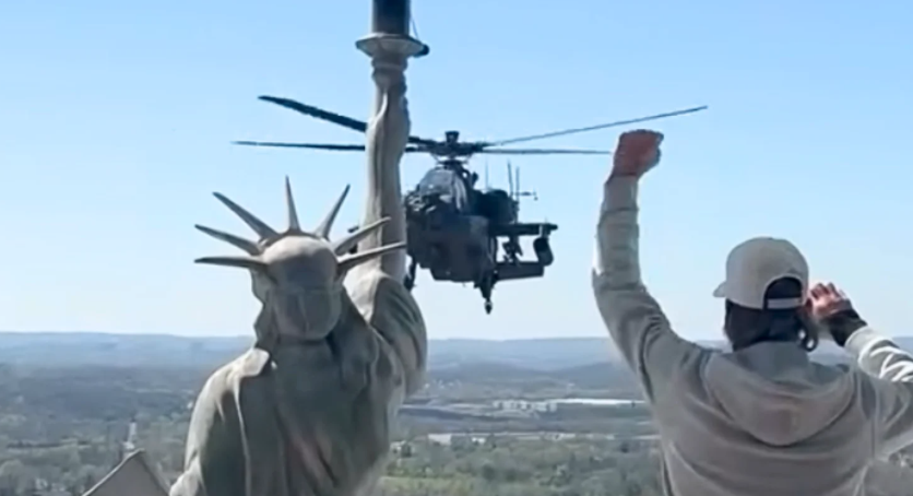 Regardless, prominent Nashville reporter Phil Williams, of News Channel 5, shared some images of the Apache helicopters, as seen in Kid Rock’s video, as they hovered just off of his property. He also said the helicopters were spotted flying over the “No Kings” protests.