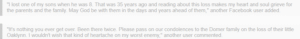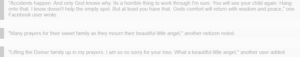 “Lifting the Domer family up in my prayers. I am so so sorry for your loss. What a beautiful little